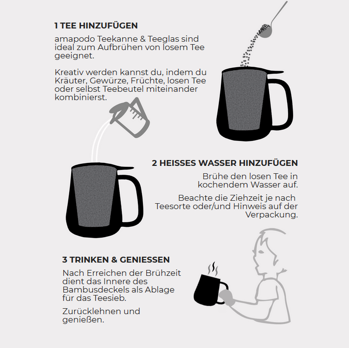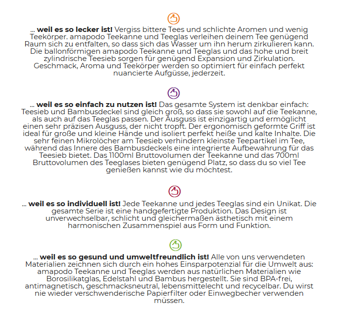 amapodo Teekanne und Teeglas sind einfach, funktional und einzigartig und ermöglichen es dir, die ganze Bandbreite dessen zu erleben, was guter Tee zu bieten hat. Am wichtigsten - sie versetzen dich in die Lage, guten, leckeren Tee zu trinken, ohne Zeitaufwand und warten. Die Teekanne und das Teeglas legen eine simple Lösung für die komplexe Teezubereitung in deine Hand - ohne die Recherchen oder lange Praxiserfahrung, die du sonst benötigen würdest.