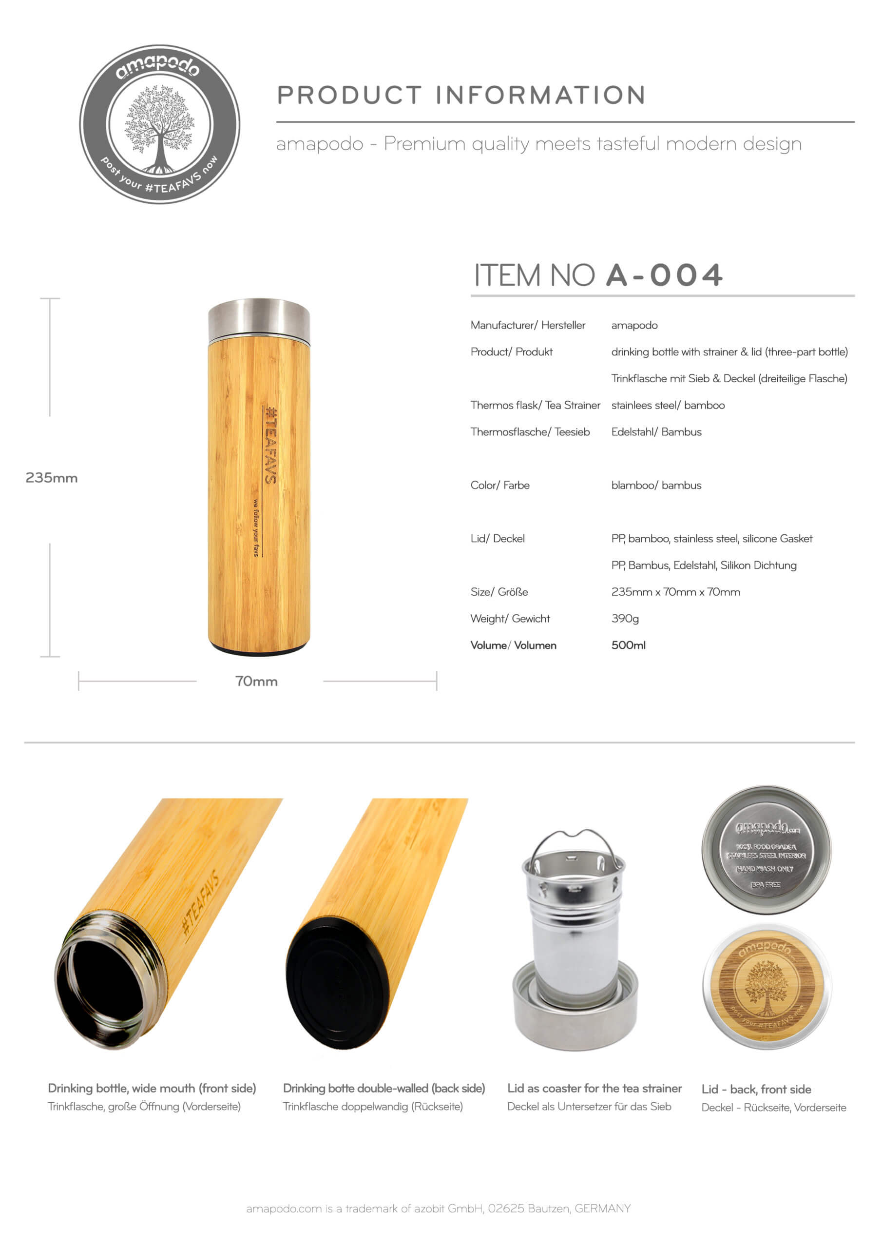 amapodo Trinkflasche Edelstahl Bambus 500ml isoliert mit Sieb, Tee Thermobecher to go 2er Pack