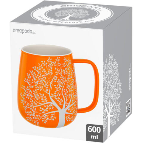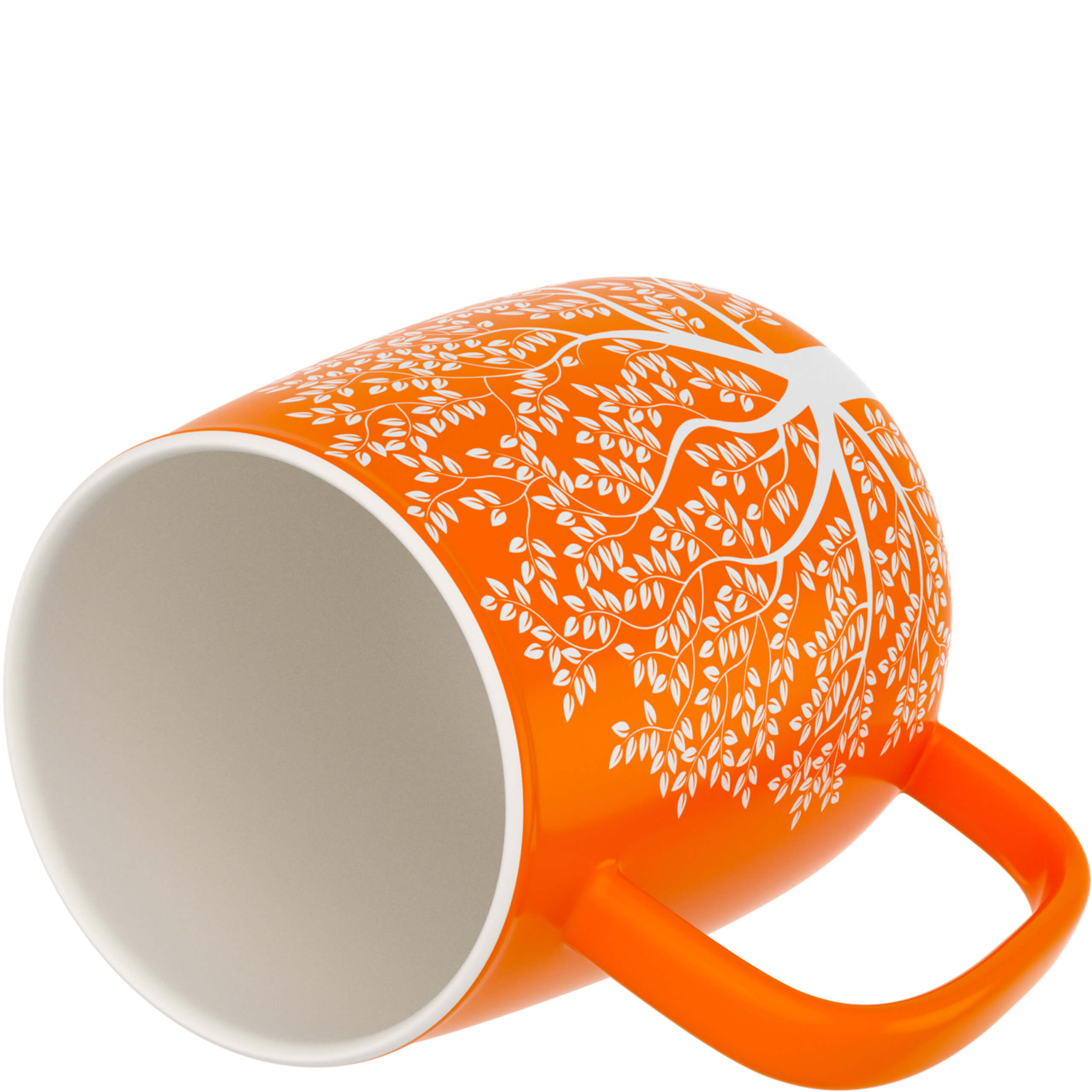 Jede Keramiktasse ist handgefertigt und damit ein echtes Einzelstück. Modernes Orange und der amapodo Baum verleihen deiner neuen Kaffee Tasse den stilvollen Look.