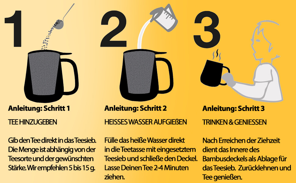 Teegenießer ziehen ein Sieb den Teebeuteln vor, da der Teegenuss und der reine Geschmack mit einem Teesieb viel intensiver ist. Teebeutel können den Geschmack des Tees verfälschen. Dosiere selbst die benötigte Menge an Tee und entnehme das Sieb zur richtigen Zeit. Starte ggf. erneut einen zweiten oder dritten Aufguss.