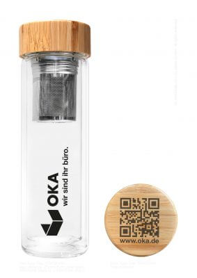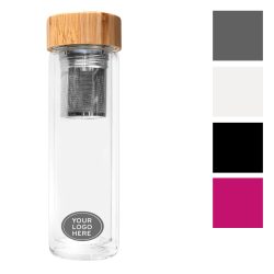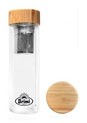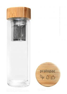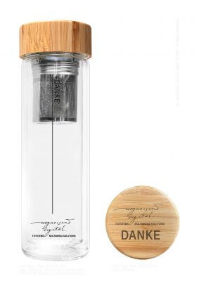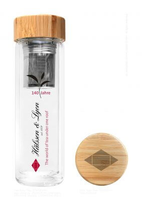 Teeflasche aus doppelwandigem Borosilikatglas. Fassungsvermögen 400ml. Das dazugehörige zweiteilige Teesieb mit Henkel aus 18/8 Edelstahl ist ineinander verschraubbar und kann einzeln oder in Kombination für sehr feinen losen Tee und größere Teeblätter oder Infusionen verwendet werden. Deckel bestehend aus echtem Bambus mit natürlicher Maserung. Mehr