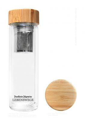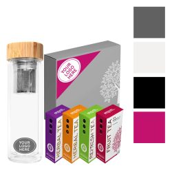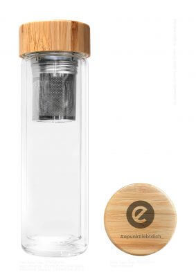 Teeflasche aus doppelwandigem Borosilikatglas. Fassungsvermögen 400ml. Das dazugehörige zweiteilige Teesieb mit Henkel aus 18/8 Edelstahl ist ineinander verschraubbar und kann einzeln oder in Kombination für sehr feinen losen Tee und größere Teeblätter oder Infusionen verwendet werden. Deckel bestehend aus echtem Bambus mit natürlicher Maserung. Zum Geschenk-Set gehören 4 TEAFAVS Teesorten (Kräutertee 80g, Kräutertee 80g, Erfrischungstee 120g, Früchtetee 200g) und eine Geschenkverpackung. Mehr