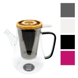 Teekanne mit Henkel aus Borosilikatglas. Fassungsvermögen 1100ml. Das dazugehörige zylindrische Teesieb mit Griff aus 304 Edelstahl verfügt über extra feine Mikrolöcher. Deckel bestehend aus echtem Bambus mit natürlicher Maserung. Der Bambusdeckel dient gleichzeitig zum Abstellen für das Teesieb. Mehr