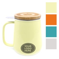 Teetasse mit Henkel aus Keramik in den Farben gelb, türkis und orange. Fassungsvermögen 700ml. Das dazugehörige zylindrische Teesieb mit Griff aus 304 Edelstahl verfügt über extra feine Mikrolöcher. Deckel bestehend aus echtem Bambus mit natürlicher Maserung. Der Bambusdeckel dient gleichzeitig zum Abstellen für das Teesieb. Mehr